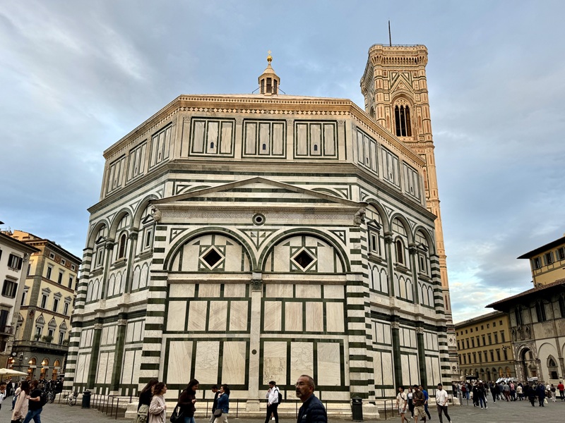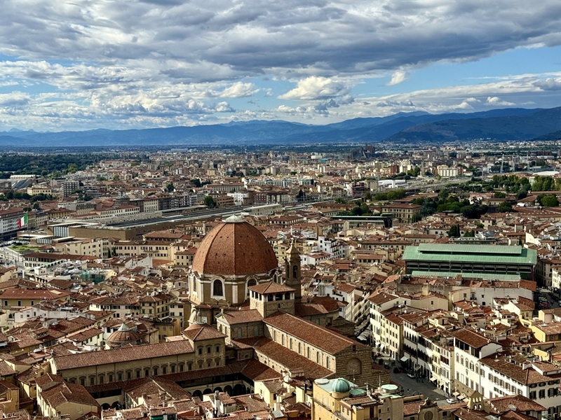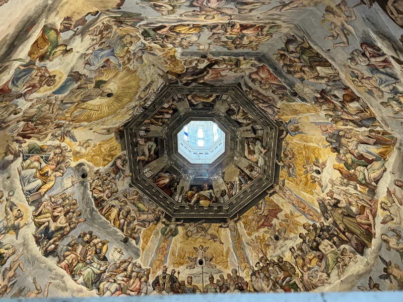 Da man hier bei der Erbauung im Jahr 1436 wenig vorausschauend auf einen Aufzug verzichtet hatte, erreichten wir den höchsten Punkt der Kuppel nach 463 Stufen über eine enge Wendeltreppe. Zunächst ging es innen direkt unterhalb eines riesengroßen, farbenprächtigen Freskos entlang, bevor wir auf einer umlaufenden Aussichtsplattform einen überragenden Blick auf Florenz hatten. Das war spektakulär und absolut empfehlenswert.