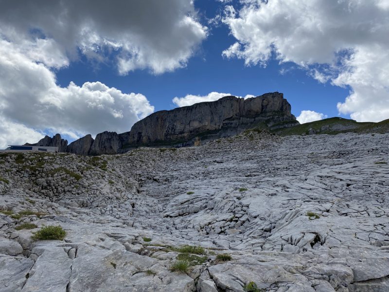 Und noch etwas stach uns von dort oben ins Auge: Das Gottesackerplateau. Schneebedeckt hatten wir es schon etliche Male per Ski und Snowboard oder zu Fuß auf einem tollen Rundweg gekreuzt. Im Sommer standen wir vor einer zerklüfteten Karst-Landschaft. Das mussten wir uns unbedingt aus der Nähe ansehen und entschieden uns für eine Schnupperrunde. Die Steine waren zwar größtenteils unbeweglich, man musste aber trotzdem ganz schön drauf achten, wohin man den nächsten Schritt setzte. Aus diesem Grund und natürlich, weil wir oft stehenblieben, um die surreale Umgebung auf uns wirken zu lassen, brauchten wir einige Zeit, bis wir wieder an der Mittelstation eintrafen. Auf der sonnigen Terrasse gönnten wir uns erstmal leckere eisgekühlte Getränke, bevor wir in die Gondel in Richtung Talstation stiegen.