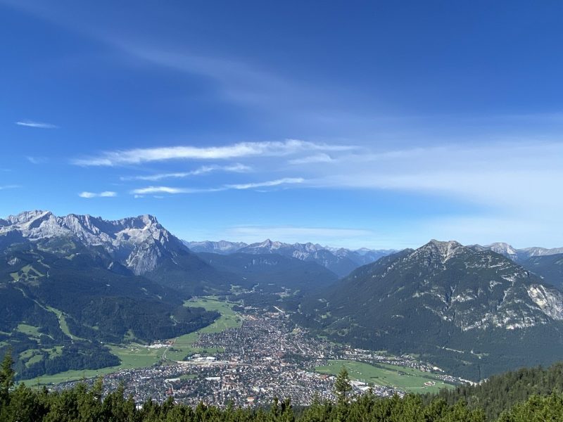 Rauf ging’s bequem in einer kleinen Gondel für 15€ pro Person (einfache Fahrt). Auf dem Panorama-Höhenweg umrundeten wir zunächst den Ameisberg, wobei wir tatsächlich immer wieder spektakuläre Ausblicke auf die oben benannten Berge und die gesamte Umgebung hatten. In weiter Ferne konnten wir sogar den Starnberger See erblicken. Kein Wunder, dass uns dieser Aussichtsberg in mehreren Reiseführern ans Herz gelegt wurde. In unserer bisherigen Wahrnehmung ging der Wank in unmittelbarer Nähe der namhafteren Berge wie Wetterstein, Alp- und Zugspitze fast ein bisschen unter. Im Gegensatz zu seinen prominenten Nachbarn war er dafür aber auch nicht komplett überlaufen.