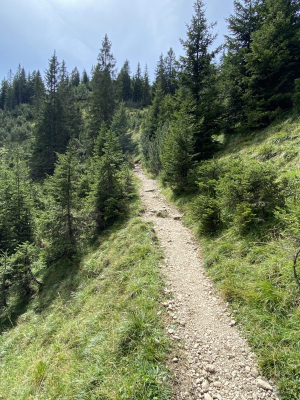 Als wir auf einen breiten Schotterweg gelangten, der ohne Umwege zur Talstation geführt hätte, nahmen wir noch eine Abzweigung nach links und folgten dem Hüttlsteig. Der Abstecher lohnte sich. Mal breitere, mal schmalere, aber durchweg gut zu gehende Pfade führten uns zunächst durch bewaldete Teilstücke. Als der Wald sich lichtete, mussten wir uns etwas konzentrierter vorwärts bewegen oder gar ein bisschen kraxeln (siehe rechts).