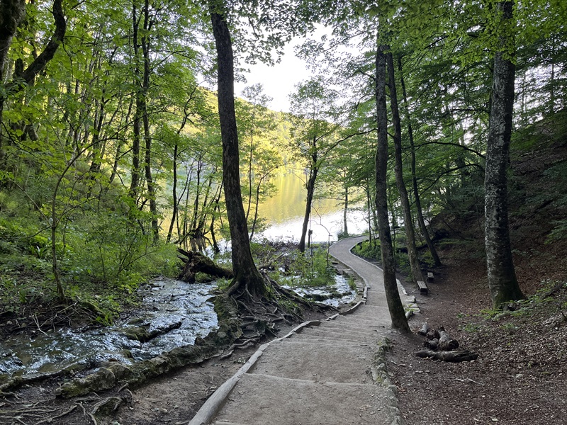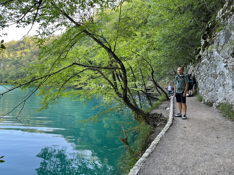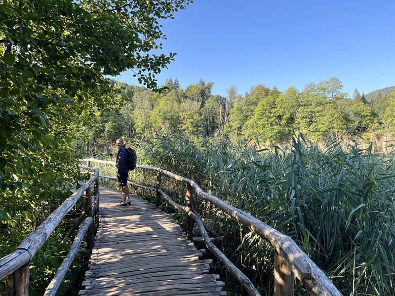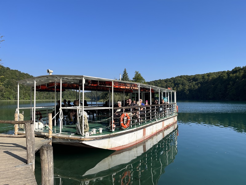 Pünktlich um 7 Uhr brachte uns der Shuttlebus vom Campingplatz zu Eingang 2, wo um diese Uhrzeit nur eine Handvoll weiterer Touristen unterwegs waren. Nach erneuter Orientierung auf der Karte entschieden wir uns spontan für die kurze Runde von etwa 10 Kilometern, die eine Bahn- und Bootsfahrt beinhaltet, weil wir in der „Wasserwelt Plitvice“ auf jeden Fall mit dem Elektroboot über den See „Kozjak“ fahren wollten.