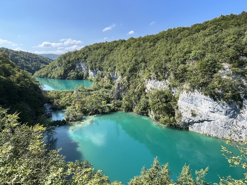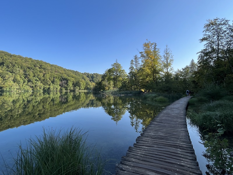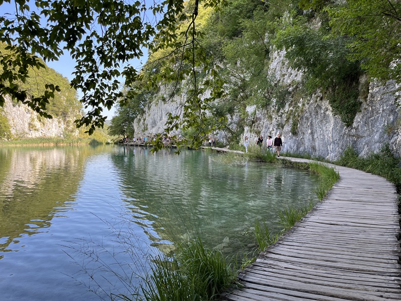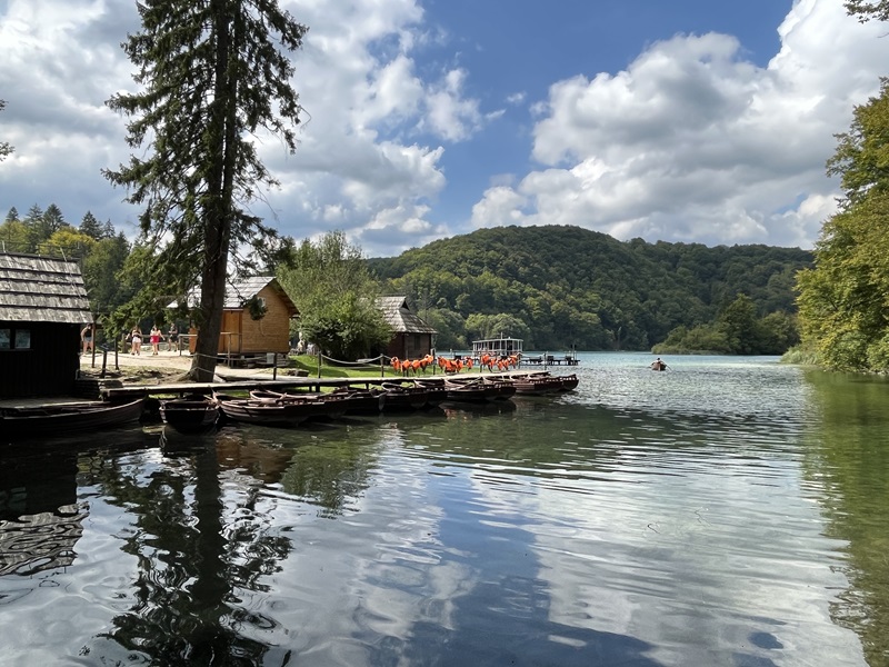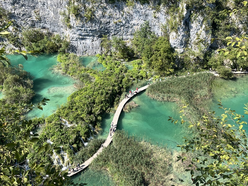 Es erwies sich als gute Idee, früh am südlichen Eingang (Eingang 2) an den oberen Seen zu starten und den Rundweg in umgekehrter Richtung zu gehen. In den ersten beiden Stunden begegnete uns kaum ein Mensch. Überall plätscherte oder gluckste es, kleine und große Wasserfälle wohin man auch blickte. Der Weg war perfekt ausgeschildert und führte uns zur Anlegestelle der Elektrofähre. Nach kurzer Wartezeit schipperten wir gemütlich bis ans andere Ufer. Ein schöner, großer Rastplatz mit Bänken, Tischen und einigen Self-Service-Restaurants lud zu einer ersten Pause ein. Erstaunt stellten wir fest, dass sich auf dieser Seite der Fähre eine beachtliche Schlange gebildet hatte. Klar, hier kamen alle an, welche die Tour an Eingang 1 begonnen hatten.